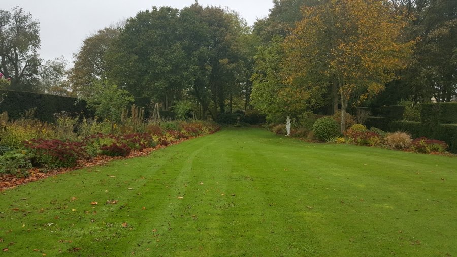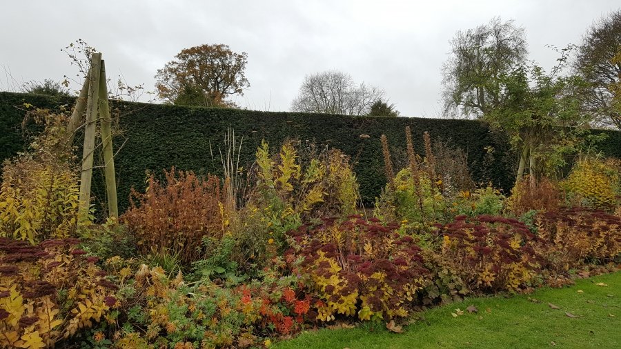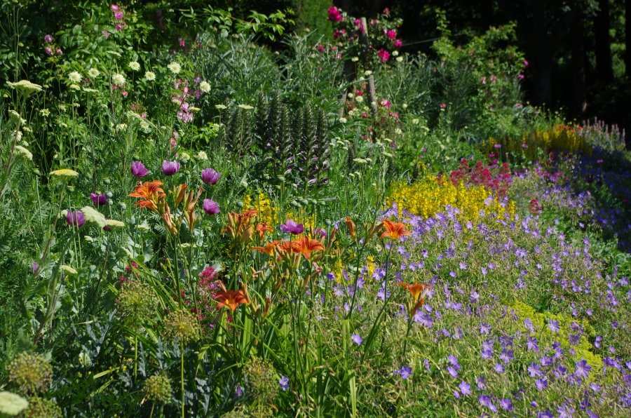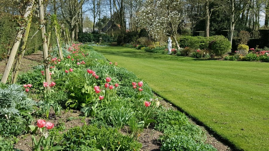 The colour scheme within the herbaceous border changes all year around. In the early spring the plants start flowering with yellow daffodils followed closely by pink tulips. The colours within the scheme change to pink, purple and blue during the late spring, caused by the presence of: Persicaria superba, Alliums and Geraniums to yellow, pink, blue and purple until autumn by Rudbeckia, Sedum, Echinops and Aster thomsonii.