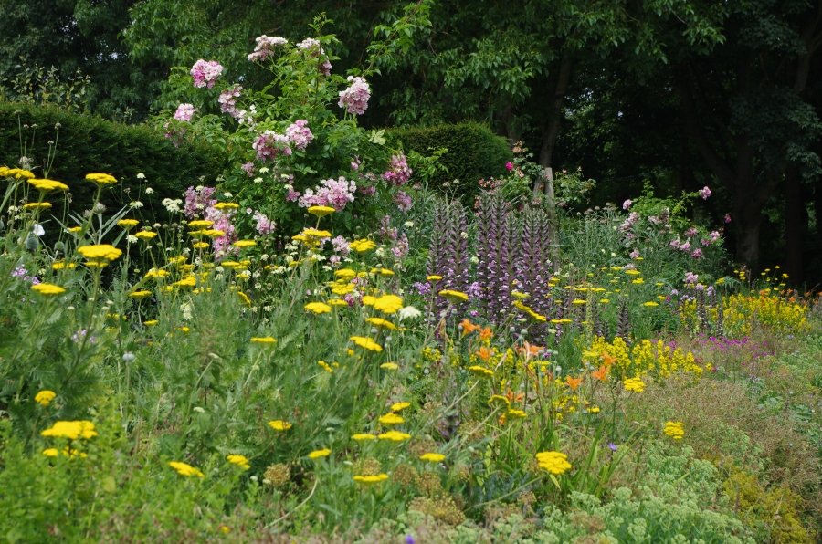 During the summer in the middle of the border, the plant, Achillea ‘Gold Plate’ provides a contrast between the floral and foliage form with the rich orange Hemerocallis.