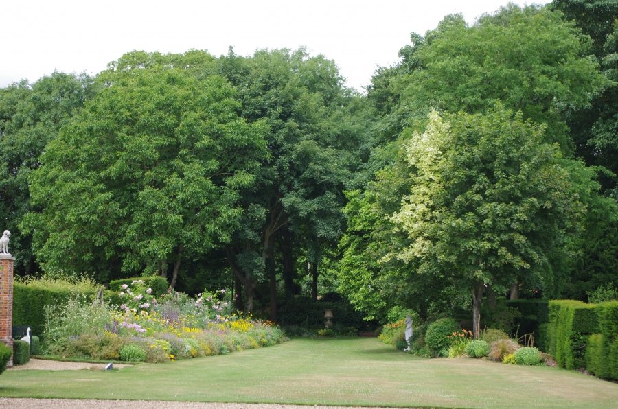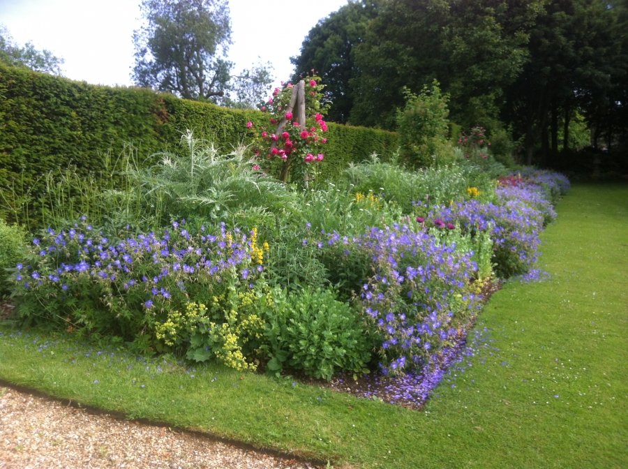 Throughout the border grass such as Calamagrostis ‘Karl Foerster’ is planted in drifts with mixture of perennials of different hues, textures and forms such as: Centranthus ruber which provide a pleasing contrast in colour and form with the Alchemilla mollis and Geraniums both of which furnished the front of the border.