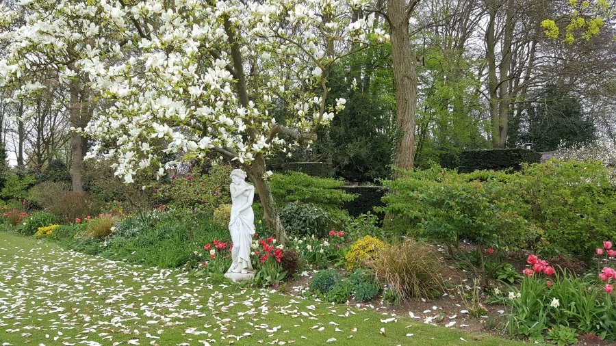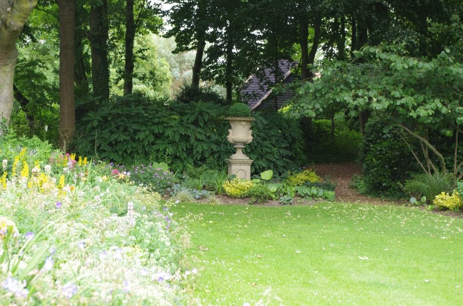 The woodland garden is planted with evergreen and deciduous shrubs such as: Mahonia, Rhododendron, Camellia, Pieris and Verbena Davidii and throughout the woodland is planted with different varieties of ferns and hostas.